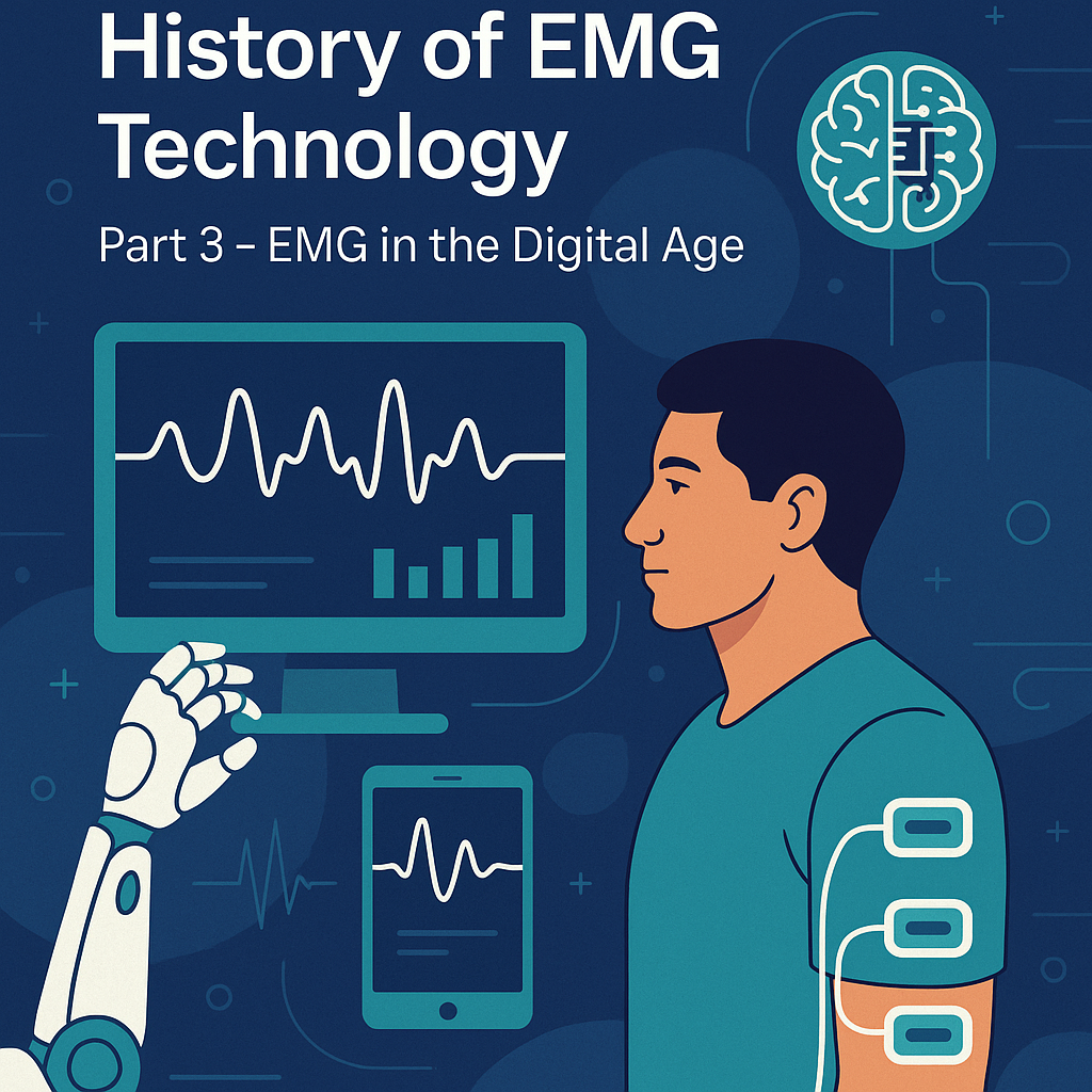 Explore how EMG technology evolved through the mid-to-late 20th century—from refined recording methods and single-fiber techniques to the rise of digital signal processing and clinical applications that revolutionized neuromuscular diagnostics, rehabilitation, and prosthetic control.